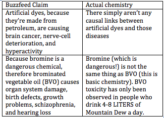 So not only did BuzzFeed (and, one presumes, the authors of the book that BuzzFeed extracted this information from) completely get the most basic chemistry wrong, it also misleads people terribly by not discussing dosage. Ingesting small amounts of a substance is not equivalent to ingesting massive amounts (the dosage that’s generally used for toxicity studies on lab animals). 12 ounces of Mountain Dew a day (the amount in a can), while certainly not good for you, isn’t equivalent to the 135-676 ounces ingested daily* by the people reported in the scientific literature as having BVO-related symptoms.