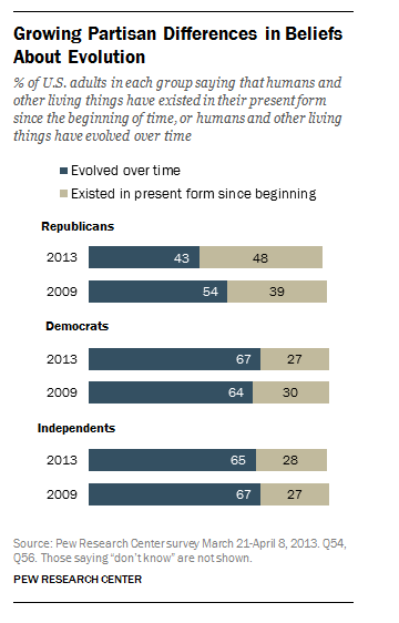 As for the Harris poll numbers, PZ Myers points out that according to this Pew poll, the number of Americans accepting the theory of evolution has increased last year to 60% (up from 50%); the first increase in decades. Depending on the accuracy of these poll numbers, (and whether it is a blip or a real trend), this may mean that we’re actually making some headway in improving public understanding of one of the fundamental scientific theories. That’s good news. The bad news is that there is a very real partisan divide between those who accept and those who reject evolution. While the GOP itself dismisses this trend as “politically insignificant”, I think it’s a serious matter of concern for the science community, and something we should consider addressing in 2014.